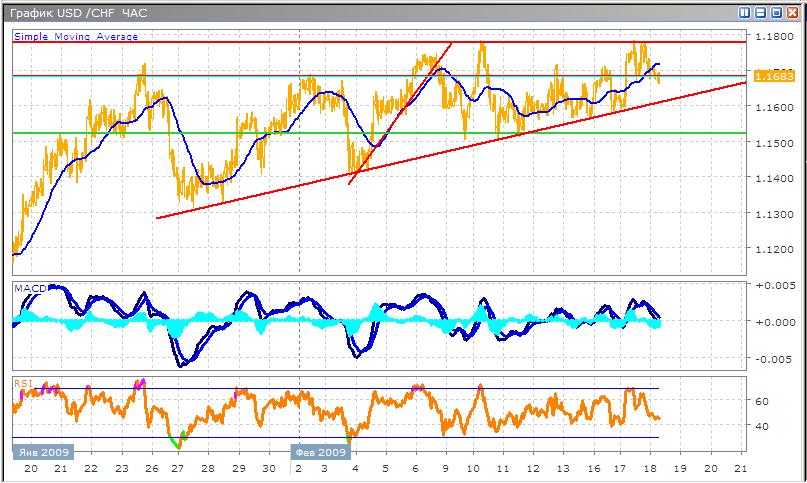 Встретив сопротивление у отметки 1.1780, быки потеряли инициативу, в результате чего цена снизилась к ранее преодоленному уровню 1.1680. Рост пары значительно замедлился начиная с прошедшего месяца, в результате чего франк торгуется в широком и пологом восходящем канале. В долгосрочной перспективе пара имеет взрывной потенциал к росту, несмотря на текущую заминку. Технические индикаторы информируют нас о возможном продолжении коррекции, что нужно учесть при размещении длинных позиций. RSI пересекает среднюю линию, подавая запоздавший сигнал на продажу, что является следствием волатильных торгов. Осциллятор MACD готовится сформировать локальный минимум, и вернуться к нулевой оси. Текущее снижение является следствием волны взятия прибыли, после активного роста пары накануне.
