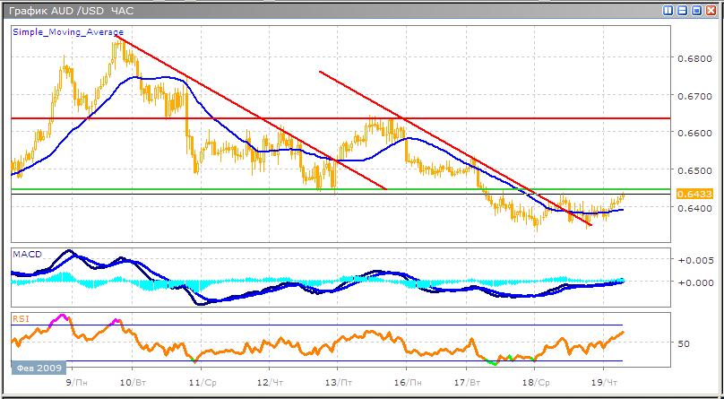 Преодолев уровень поддержки, оптимизм медведей несколько снизился, в результате чего пара замедлила снижение. Основной причиной укрепления австралийского доллара стал рост цен на золото, поскольку инвесторы обратились в сторону надежных активов. Все же в долгосрочном планировании пара находится во власти продавцов, на что и стоит ориентироваться даже при кратковременном входе в рынок. А в настоящий момент RSI подает сигнал на покупку, пересекая среднюю линию, что иллюстрирует уверенность быков, даже несмотря на достаточно длительные торги в боковом тренде. Осциллятор MACD сегодня мало информативен. Гистограмма находится у нулевой отметки, и скользящие, соответственно, приближаются к оси. Исследуя ранние ближайшие коррекции, можно ожидаться, что текущий рост может затянуться на несколько торговых дней, однако эффективного движения ожидать не стоит.