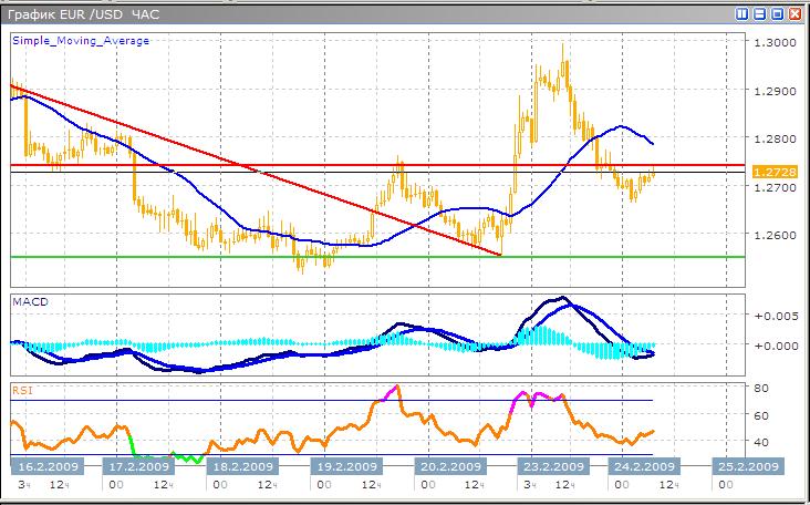 Как и ожидалось, после активного роста против среднесрочного тренда, пара начала снижение, продолжая характер открытия торгов. Ранее протестировав поддержку, цена отскочила от нее, что было также поддержано ухудшением настроения инвесторов и падением фондовых рынков. В настоящее время технические индикаторы сигнализируют об остановке корректирующего движения, и краткосрочном росте. Гистограмма MACD пересекла свою скользящую снизу вверх, приближаясь к нулевой оси. График индикатора RSI отразившись от области перепроданности, направлен вверх, что также является вторичным сигналом к покупке. Однако учитывая среднесрочные тенденции, занимать длинную позицию достаточно опасно.