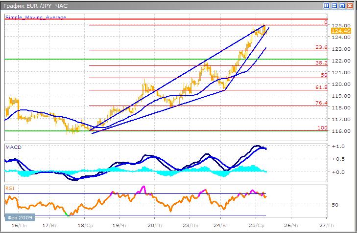 Валютная пара ускорила рост, демонстрируя, на протяжении последних двух недель, классическую возрастающую пятиволновку Эллиота. В настоящий момент торги протекают в пятой импульсной волне, при этом оптимизм быков по-прежнему велик, а медведи заняли выжидающую позицию. Ранних сигналов к развороту еще нет, пара растет уверенными темпами, при этом рост поддержан фундаментальными факторами, основным из которых является оптимизм инвесторов фондовых рынков, возникший после вчерашнего выступления Бернанке. Наиболее вероятно, что сегодня рост продолжится, однако менее активный чем вчера. Пара близка к коррекции, которую, вероятно мы увидим к концу недели, цель снижения — уровень фибоначчи 38.2%, 121.50, и следующий за ним 120.50, при преодолении обоих этих уровней, цена,вероятно устремится к 118.00. Размещение коротких позиций в данный момент опасно, поскольку риски роста по прежнему велики. Момент коррекции рекомендуем идентифицировать на более мелком графике, по дивергентным сигналам основных трендовых индикаторов.
