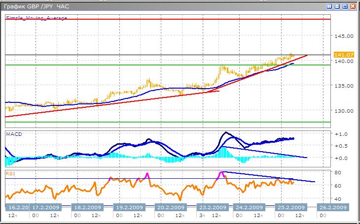 Вопреки ожиданиям скорого разворота, пара, напротив, ускорила рост, на фоне снижения доверия инвесторов к японской валюте. Сегодняшняя ожидается продолжение многодневной тенденции, вследствие вчерашнего оптимизма на американских площадках и росте азиатских индексов, открывшихся сразу полуторапроцентным ростом. Ожидаемый рост будет, вероятно, уже не таким активным, о чем свидетельствуют технические индикаторы. В настоящий момент пара растет достаточно уверенно, без рывков и коррекций, что может означать, что возможный откат будет зигзагообразного типа. Осциллятор MACD демонстрирует медвежье расхождение, что является плохой новостью для быков, однако движущая сила возрастающего тренда по-прежнему велика. Аналогичный сигнал подает и индикатор RSI, очередная вершина которого ниже предыдущей, при этом обе вершины находятся в экстремальной зоне перекупленности. Размещение длинных позиций возможно только с предположением низких целей, более надежным решением станет ожидание коррекции и покупка японской йены против фунта.