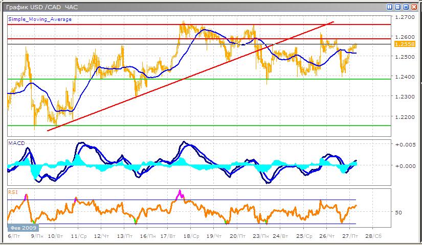 Пара длительное время торгуется в широком диапазоне, при этом, в течение последней торговой недели амплитуда колебаний значительно сократилась что позволяет более продуктивно торговать в боковом тренде. В настоящее время торги протекают в рамках краткосрочной восходящей тенденции, приближаясь к верхней границе меньшего диапазона 1.2580. Размещение торговых позиций в данном тренде достаточно опасно, поскольку потенциал его снижается по мере приближения к заявленному уровню. Наиболее рациональный подход в данной ситуации будет предполагать ожидание приближения цены к верхней границе диапазона, и последующая продажа от этого уровня. Технические индикаторы уже сигнализируют об ослаблении оптимизма быков, осциллятор RSI замедлил рост, и готовится к развороту, в свою очередь осциллятор MACD подает второстепенный сигнал на продажу, пересекая гистограммой свою скользящую сверху вниз. Торговля данной парой сопряжена со значительным риском, поскольку канадская валюта достаточно сильно реагирует на статистику США, что делает прогнозирование движений по данной паре трудно прогнозируемой.