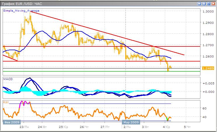 Нисходящий тренд продолжился по данной паре, как и ожидалось ранее. Активный рост на прошлой неделе был вызван в первую очередь ростом интереса инвесторов к риску на фоне волатильных торгов на фондовых рынках. Недавнее острое снижение, вызванное выходом отчетности страховщика AIG, убытки которого в четвертом квартале прошлого года достигли рекордного уровня за всю корпоративную историю США, превысив 60 млрд. долларов. На фоне таких данных, основные фондовые индексы обновили минимумы 15-летней давности, поэтому в данный момент доллар США пользуется спросом со стороны инвесторов, как резервная валюта. Ожидается, что такое отношение инвесторов продлится до конца недели, если какие-либо другие неожиданные факторы не изменят приоритеты. Технические индикаторы сигнализируют о том, что медведи взяли небольшую паузу, в результате чего в краткосрочной перспективе стоит ожидать умеренного роста. Ясных сигналов к покупке еще нет, однако перейдя с часового графика на 30-минутный, отмечаем, что осциллятор MACD демонстрирует бычье схождение, что говорит о предстоящем развороте. Окончание коррекции можно смело воспринимать, как благоприятный момент для входа в рынок в короткой позиции.