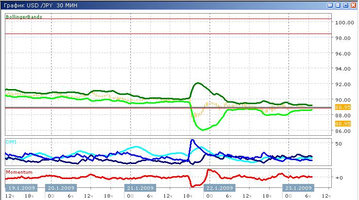 Доллар к йене за сегодня успел достичь как первого внутридневного максимума на уровне 89.24, так и первого за день минимума на уровне 88.86. На настоящий момент пара колеблется торгуется вблизи 88.99. ADX находится вблизи 20, DI+ показывает 23. В течение дня возможно как снижение не ниже 88.00, так и рост до уровней 89.50-90.00.