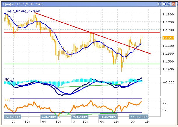 Среднесрочный нисходящий тренд завершился, о чем свидетельствует графический анализ пары на часовом графике. Дивергентные сигналы о развороте тренда, вероятно разрешатся уже в ближайшем будущем, в результате чего, ожидается тестирование уровня 1.1680, которые ранее остановил восстановление. Фундаментальная картина располагает к росту пары, в течение предстоящих нескольких сессий ожидается повышение спроса на доллар США. Технические индикаторы информируют о некоторой вероятности коррекционного краткосрочного движения, осциллятор MACD подает сигнал на продажу, пересекая гистограммой скользящую в нисходящем направлении. График RSI после непродолжительного снижения вновь устремился вверх, однако впереди расположена область перекупленности, которая уже снижает оптимизм покупателей.