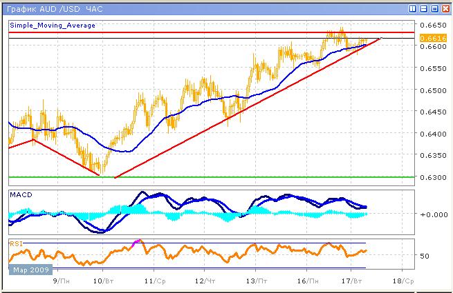 Возрастающий тренд встретил на своем пути уровень сопротивления, который, вероятно будет преодолен. Активность роста несколько снизилась, однако, фундаментальные данные указывают на предстоящее укрепление пары, на фоне достаточно нейтральных результатов развития австралийской экономики. Роста цен на товарных рынках также поддержит австралийскую валюту. Индикатор MACD информирует нас о продолжении роста в среднесрочной перспективе, однако с учетом глобального тренда, к размещению длинных позиций стоит отнестись серьезно. График индикатора RSI не дает оптимистичных прогнозов, но находится выше средней линии, что можно воспринимать в качестве сигнала о том, что моментум бычьего тренда все еще положительный.