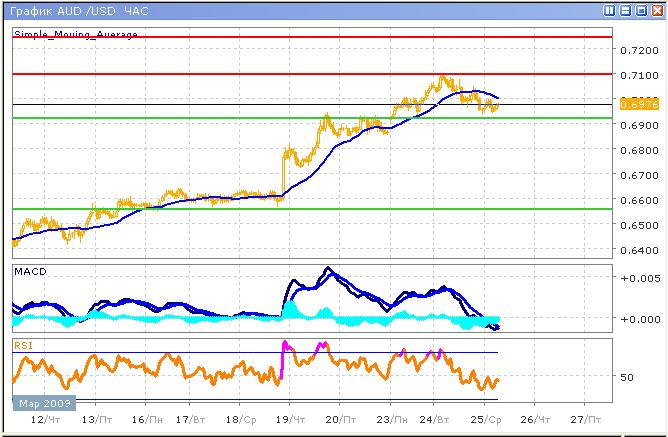 Рост постепенно замедляется, поскольку цена достигла значительных уровней и где покупки не так привлекательны. Возрастающий тренд встретил на своем пути уровень сопротивления 0.7100, который, вероятно будет концом среднесрочного роста. Недавнее снижение цен на сырьевых рынках окажет давление на австралийскую валюту, которая является сырьевой. Индикатор MACD информирует нас о продолжении краткосрочного роста, однако с учетом глобальных настроений, длительного возрастающего тренда ожидать не стоит. График индикатора RSI пока не дал сигналов на покупку, однако совершенно очевидно, что моментум бычьего тренда будет расти. Все же от длинных позиций рекомендуем воздержаться, более безопасной стратегией было бы ожидание завершения роста, и продажа у сопротивления.