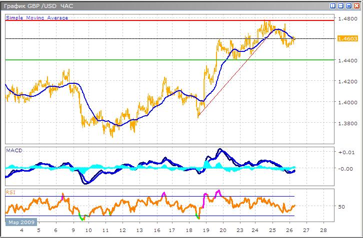 Рост пары вероятно продлится еще некоторое время, о чем говорят технические индикаторы, и глобальные настроения инвесторов, которые в данный момент находятся в состоянии оптимизма после событий прошедшей недели. Рост, тем не менее, значительно замедлился, и протекает достаточно нервозно, что говорит не в пользу возрастающего тренда. Гистограмма осциллятора MACD уже на протяжении длительного времени демонстрирует отсутствие направленной динамики, колеблясь около нулевой отметки, на часовом графике. Наиболее вероятно, что цена будет либо падать, либо двигаться в боковом тренде на сегодняшних торгах, однако сигналы достаточно расплывчаты и нуждаются в подтверждении. График RSI прекратил рост, коснувшись средней линии, и постепенно снижается. Такая динамика не гарантирует скорейшего снижения цен, но достаточно красноречиво говорит о слабости покупательской активности. Итак в среднесрочной перспективе ожидаем рост, в течение сегодняшних торгов превалирует ожидание снижения.