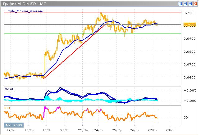 Возрастающий тренд встретил на своем пути уровень сопротивления 0.7100, который, вероятно будет преодолен в ближайшем будущем, после завершения неглубокой коррекции. Активность быков значительно снизилась, однако, фундаментальные данные указывают на предстоящее укрепление пары, на фоне роста цен на сырьевых рынках и росте общего недоверия доллару США. Индикатор MACD иллюстрирует отсутствие активности как продавцов, так и покупателей, и предупреждает участников рынка о краткосрочном развитии бокового тренда в узком диапазоне между поддержкой и сопротивлением. График индикатора RSI не дает оптимистичных прогнозов, но напротив пересекает среднюю линию в нисходящем направлении, подавая сигнал на продажу. В течение сегодняшней сессии, наиболее вероятно снижение к поддержке, после чего продолжится рост.
