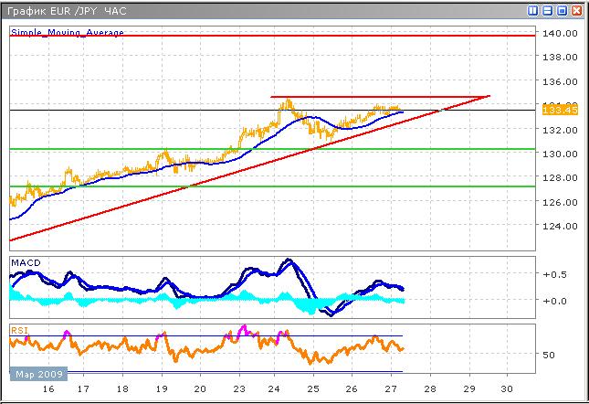 Пара встретила локальный уровень сопротивления, 134.60, который ограничит рост в краткосрочной перспективе, однако, потенциал покупателей еще не исчерпан, результатом чего может стать прорыв уровня к концу следующей недели. В настоящий момент рост замедлился, и быки демонстрируют признаки слабости, целью краткосрочного снижения может стать уровень 130.25, ближайшая поддержка. Индикаторы только начали сигнализировать о слабости покупателей, динамика моментума тренда, который иллюстрирован индикаторами на графике, согласуется с ценовым графиком, что говорит об отсутствии необоснованных ценовых бросков, но напротив, цена представляет собой действительный баланс. На часовом графике осциллятор MACD демонстрирует медвежьи настроения, гистограмма развивается в отрицательной зоне, что исключает возможность покупок.