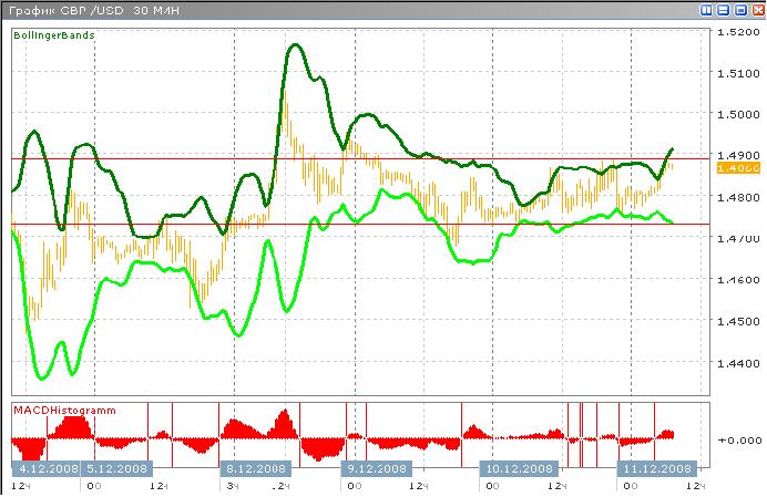 И вновь мы наблюдаем унылое боковое движение вблизи уровня поддержки 1.4732. На данный момент GBP/USD растет, но уже видно, как он, оттолкнувшись от верхней линии Боллинжера, разворачивает направление своего движения. Логично снизить уровень сопротивления до 1.4085 с 1.5075. Такое движение скорее всего продлится до конца дня с возможным некоторым расширением границ торгового диапазона.