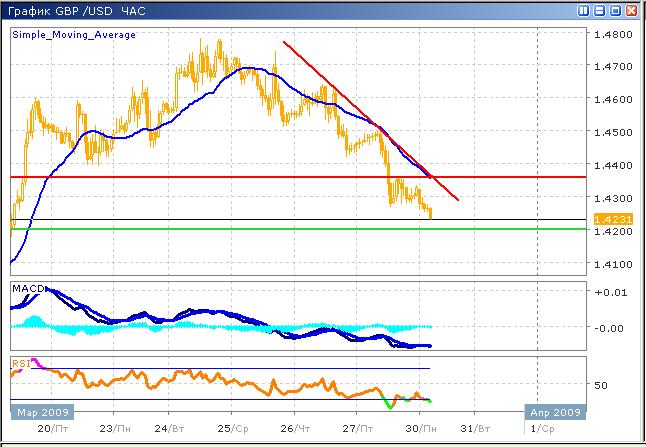 В течение сегодняшнего дня ожидается продолжение коррекции, с целью, по меньшей мере к уровню 1.420. Британский фунт более активно реагирует на изменения в долларовых тенденциях, чем единая валюта. Этот фактор особенно ярко был проиллюстрирован динамикой торгов последних нескольких дней, когда английская валюта начала терять позиции против доллара еще задолго до резкого падения евро. Снижение пары вполне может предшествовать снижение индексов на торгах в Нью-Йорке, поскольку напряжение на рынках будет расти в течение предстоящих нескольких дней на ожиданиях встречи на высшем уровне G20. Технические индикаторы указывают на возможное продолжение торгов в боковом коридоре, с приоритетом снижения. График индикатора RSI достигнув верхнего уровня области перепроданности , развивается в боковом сценарии, в то время как гистограмма MACD находится около нулевой оси, иллюстрируя отсутствие какой-либо движущей силы, что в условиях среднесрочного нисходящего тренда, становится дополнительным сигналом слабости быков.