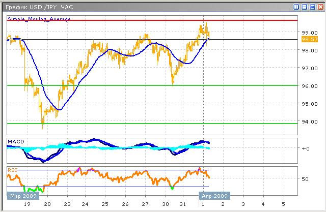 Японская иена стремительно теряет позиции против доллара США, при этом бычий сценарий по паре наиболее вероятен в среднесрочной перспективе. На часовом графике можно наблюдать систему сложных коррекционных движений, итогом которых стало формирование перевернутой фигуры голова-плечи, которая расположилась в затяжной коррекционной волне. В настоящий момент цена находится у уровня сопротивления 99.60, который в краткосрочном плане может задержать рост. Технические индикаторы указывают на предстоящее снижение перед продолжением развития возрастающего тренда. График индикатора RSI вышел из зоны перекупленности и направляется к средней линии, в то время как гистограмма осциллятора MACD пересекла нулевую ось, и растет в отрицательной зоне, при этом скльзящие индикатора формируют соответствующий сигнал.