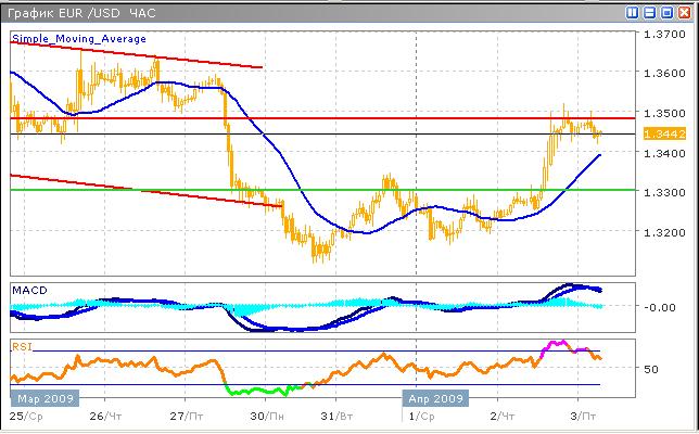 Рост пары находится под угрозой, от разворота ее удерживает только неожиданный оптимизм на фондовых рынках, вызванный сильными данными по промышленным заказам, но основной причиной стала встреча на высшем уровне в Лондоне. На часовом графике отчетливо наблюдается замедление роста, после активного броска, что является первым сигналом к краткосрочному развороту. Цена находится под достаточно сильным уровнем сопротивления 1.3480, который преодолеть будет не просто, но в случае пробоя, вероятность закрепления цены выше этого уровня достаточно высока. Однако в среднесрочном плане ожидается снижение. Технические индикаторы указывают на предстоящую коррекцию, гистограмма индикатора MACD пересекла нулевую линию в нисходящем направлении, при этом скользящие средние пересекаются таким образом, что возникает сигнал на продажу. График индикатора RSI вышел из зоны перекупленности, подтверждая предположение, что силы быков находятся на исходе.