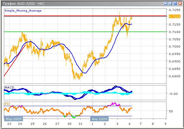 В данный момент пара демонстрирует уверенный восходящий тренд, встретив на пути сопротивление 0.7210, которое, вероятно, будет взято сегодня. Ранее, дважды протестировав данный уровень сопротивления, цена в очередной раз устремилась к нему. В данный момент, в среднесрочной перспективе, пара продолжит рост с долгосрочной целью 0.7500, но достижение этой отметки займет много времени. Технический анализ информирует о вероятном ускорении возрастающего тренда, поэтому в течение сегодняшней сессии рост имеет достаточно массивный потенциал. Осциллятор MACD демонстрирует рост, однако низкая ценовая активность должна насторожить инвестора, скользящие средние индикатора пока не подают каких-либо разворотных сигналов. График индекса относительной силы, только приближается к области перекупленности, что дает некоторую надежду на продолжение роста.