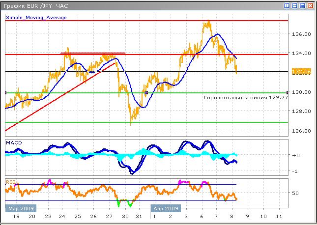 Пара встретила локальную поддержку у отметки 132.00, которая будет преодолена к середине дня, поскольку потенциал продавцов еще не исчерпан. Результатом текущей тенденции может стать падение цен к следующему уровню 127.80, что будет достаточно сильным прорывом. В настоящий момент активность медведей выросла, целью краткосрочного снижения может стать уровень 131.00, ближайшая поддержка. Индикаторы начали сигнализировать об усилении нисходящего тренда, динамика моментума, который иллюстрирован индикаторами на графике, согласуется с ценовым графиком, что говорит об отсутствии необоснованных ценовых бросков, но напротив, цена представляет собой действительный баланс. На часовом графике осциллятор MACD демонстрирует медвежьи настроения, гистограмма развивается в отрицательной зоне, что исключает возможность покупок.
