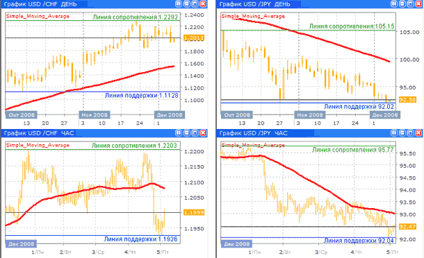Прошедшая торговая неделя не принесла каких либо серьезных изменений в курсах доллара США. Экономическая ситуация в Соединенных Штатах все более и более складывается в негативную картину. Индекс деловой активности в производственном секторе (ISM) продемонстрировал самое большое снижение в месяц за последние 26 лет. Изменение рабочих мест в частном секторе за ноябрь составило вопреки прогнозам -250 тыс., что свидетельствует о нарастающей волне увольнений. Судя по всему валютные трейдеры продолжают игнорировать фундаментальные данные, опираясь для принятия решений в основном на изменчивую динамику фондовых рынков. На наш взгляд в связи с этим курсы доллара сейчас находятся в шатком равновесии. На поведение американской валюты влияют также и низкие цены на нефть. Власти США продолжают изыскивать антикризисные меры. Так, в четверг глава ФРС Бен Бернанке заявил, что необходимо принимать более решительные меры для предотвращения потерь жилья, вплоть до выкупа заложенных домов государством.