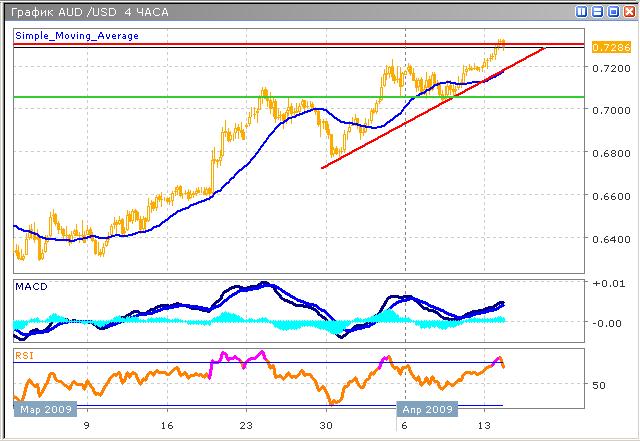 Бычий тренд встретил на своем пути очередной уровень сопротивления 0.7300, который, вероятно будет преодолен с незначительной коррекцией. Активность роста несколько снизилась, однако, фундаментальные данные указывают на предстоящее укрепление пары, на фоне относительно успешных результатов развития австралийской экономики. Роста цен на товарных рынках также поддержит австралийскую валюту, слабое восстановление на сырьевых рынках отмечается уже несколько недель. Индикатор MACD информирует нас о продолжении роста в среднесрочной перспективе, однако с учетом глобального тренда, к размещению длинных позиций стоит отнестись серьезно. График индикатора RSI не дает оптимистичных прогнозов, выходя из области перекупленности, что можно воспринимать в качестве краткосрочного сигнала к продаже.