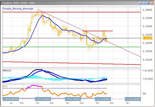 Среднесрочной перспективе наиболее вероятно продолжение нисходящего тренда по паре, несмотря на достаточно позитивный фон, заданный торгами в США и Азии на фондовых рынках, ожидается укрепление американского доллара. Однако в краткосрочной перспективе, вероятен рост, после активного снижения в начале дня, о чем говорят технические индикаторы. Рост цен встретил локальный уровень сопротивления 1.3270, который не был преодолен, в результате чего цена снизилась. Вероятность пробоя этого уровня достаточно мала, поскольку покупатели явно выдохлись, что отражено в сегодняшних ранних торгах. Технические индикаторы пока не дают отчетливых сигналов к покупке на короткий срок, но напротив, график индикатора RSI пересекает сверху вниз средний уровень, после бокового развития. Гистограмма MACD в это время формирует локальный максимум, и снижается, что также является косвенным сигналом к продаже.
