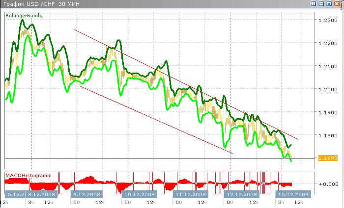 Для доллара определенно настали не лучшие времена. Франку он так же как и евро проигрывает уже около недели и прекращать, похоже, не собирается. Устойчивый нисходящий тренд наблюдается открытия прошлой недели. На данный момент линии Боллинжера расходятся, так что не стоит надеяться на какой-либо резкий скачок и уж тем более на смену направления. Доллар уже упал до уровня 11 ноября, то есть более чем месячного минимума и, судя по всему, упадет и дальше. В дальнейшем текущий уровень 1.1707 видится уровнем сопротивления.