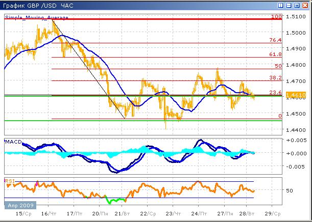 Ожидается продолжение колебания пары в широком диапазоне до тех пор, пока не станут ясны перспективы фондового рынка. В настоящий момент падение завершилось, и далее возможен рост к уровню коррекции 1.4780, после чего, рост возобновится, вероятно в виде пологого коридора, лишь усилив текущий характер. Проведя технический анализ пары, отмечаем, что имеем большинство сигналов на продажу в краткосрочной перспективе. Индикатор MACD продолжает наращивать моментум нисходящего тренда, а его скользящие пересекаются соответствующим образом. Ценовой график в настоящий момент пересекает скользящую среднюю с периодом 26 сверху вниз, а график индикатора RSI пересек среднюю линию сверху вниз, подавая сигнал на продажу. Поскольку фундаментальная причина текущих движений связана с пессимизмом инвесторов на фондовом рынке, цели снижения не рекомендуется отмечать слишком низко.