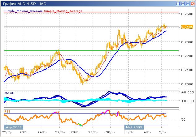 В данный момент пара демонстрирует уверенный восходящий тренд, встретив на пути сопротивление 0.7400. Ранее, дважды протестировав данный уровень сопротивления, цена преодолела его, достигнув максимальной в этом году отметки. В данный момент, в среднесрочной перспективе, пара продолжит рост с долгосрочной целью 0.7500, но достижение этого уровня займет много времени. Технический анализ информирует о вероятном ослаблении возрастающего тренда, поэтому в течение сегодняшней сессии рост имеет слабый потенциал. Осциллятор MACD демонстрирует рост, однако низкая ценовая активность должна насторожить инвестора, скользящие средние индикатора пока не подают каких-либо разворотных сигналов. График индекса относительной силы, только приближается к области перекупленности, что дает некоторую надежду на продолжение роста.
