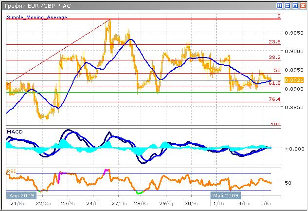 В настоящий момент на часовом графике мы можем наблюдать завершенную пятиволновку Элиота, коррекционная волна, состоящая из трех составляющих, прошла в противоположном росту направлении чуть более 61.8%. Первая импульсная волна началась в середине апреля, вся восходящая структура, завершилась 24 апреля, и в данный момент мы находимся в конце вольны (с). Таким образом, в среднесрочной перспективе ожидаем начала следующей восходящей волны более высокого порядка к отметке 0.900. Гистограмма MACD расположена приближается к нулевой оси, демонстрируя при этом постоянство, скользящие средние индикатора подают сигнал на продажу, пересекаясь соответствующим образом с гистограммой. График индикатора RSI демонстрирует, снижение, что может насторожить покупателей, поэтому рекомендуется дождаться положительных сигналов от обоих индикаторов, после чего вступать в растущий тренд.