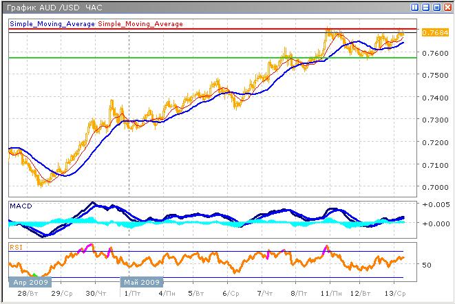 Бычий тренд встретил на своем пути очередной уровень сопротивления 0.7690, который, вероятно будет преодолен с незначительной коррекцией. Активность роста несколько снизилась, однако, фундаментальные данные указывают на предстоящее укрепление пары, на фоне относительно успешных результатов развития австралийской экономики. Роста цен на товарных рынках также поддержит австралийскую валюту, слабое восстановление на сырьевых рынках отмечается уже несколько недель. Индикатор MACD информирует нас о продолжении роста в среднесрочной перспективе, однако с учетом глобального тренда, к размещению длинных позиций стоит отнестись серьезно. График индикатора RSI не дает оптимистичных прогнозов, выходя из области перекупленности, что можно воспринимать в качестве краткосрочного сигнала к продаже.