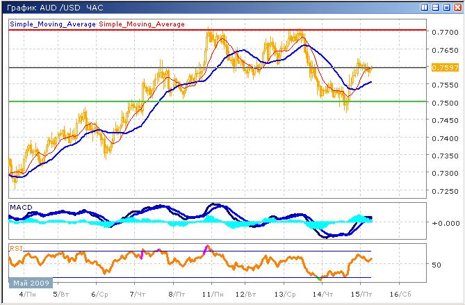 Пара продолжила колебания в широком диапазоне, дважды протестировав уровень сопротивления 0.7700, и как ожидалось, штурм уровня на этом закончился. Цена устремилась вниз, но рост на этом не завершится. Технический анализ информирует о завершении возрастающего тренда, поэтому в течение сегодняшней сессии ожидается снижение. Осциллятор MACD формирует двойной сигнал на продажу, гистограмма пересекает нулевую ось, скользящие средние также пересекаются таким образом, что формируется сигнал к продаже. График индекса относительной силы, коснувшись области перекупленности, развернулся, и приблизился к средней линии, пересечение которой также даст сигнал к продаже.