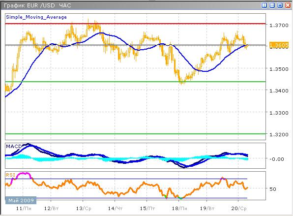 Наиболее вероятно продолжение колебаний цены широком диапазоне, до тех пор, пока не установится устойчивый тренд, который, как ожидается, будет восходящим. В краткосрочной перспективе, вероятно снижение, после активного роста, о чем говорят технические индикаторы. Рост встретил локальный уровень сопротивления 1.3700, который до сего момента сдерживал быков. Вероятность пробоя этого уровня достаточно велика, однако в обозримом будущем этого не случится. Технические индикаторы не дают отчетливых торговых сигналов, есть лишь знаки продолжения нисходящей коррекции. График индикатора RSI пересекает среднюю линию сверху вниз, однако снижение резко замедляется. Гистограмма MACD в это время снижается, иллюстрируя рост моментума медвежьего тренда.