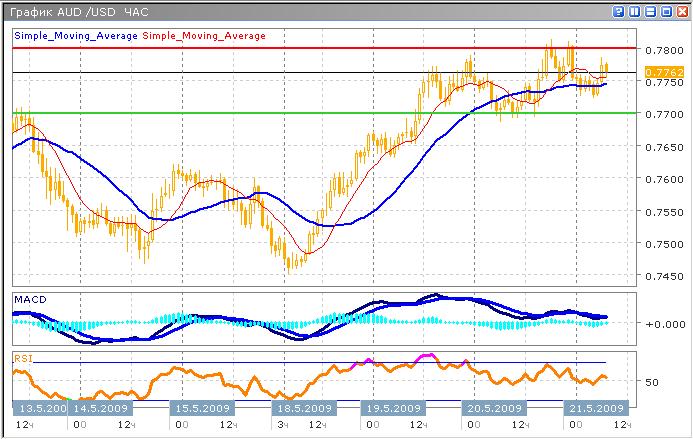 Динамику торгов на валютном рынке в настоящее время определяют фондовые рынки, поскольку они первыми отреагируют на начало восстановительных тенденций в крупнейших экономиках мира. В настоящий момент азиатские рынки снижаются на фоне неуверенности инвесторов в отношении ожиданий восстановления американской экономики. В связи с этим, в краткосрочном периоде ожидается укрепление австралийской валюты с целью 0.7800, данный уровень ранее уже тестировался. В среднесрочной перспективе достаточно велика доля вероятности роста пары к уровню 0.800, после отработки данного уровня последует глубокая коррекция. Гистограмма MACD пересекает снизу вверх нулевую отметку, подавая слабый сигнал на покупку. Индикатор RSI сигнализирует об отсутствии идей, как к покупкам так и к продажам, предвосхищая непродолжительный боковой тренд. Настоящий момент не является выгодным для входа в рынок, рекомендуется дождаться завершения нисходящего тренда, который уже выдыхается, и занять позицию в бычьем тренде.