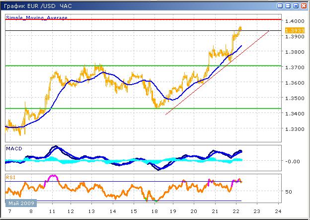 Наиболее вероятно продолжение восходящей тенденции, после непродолжительной коррекции. Фундаментально доллар остается под давлением, а после возобновления восходящего тренда на фондовых рынках, интерес к американской валюте пропадет. На пути бычьего тренда находится достаточно прочное сопротивление 1.400. Вероятность пробоя этого уровня велика, поскольку покупатели имеют высокий потенциал. Технические индикаторы указывают на постепенное снижение активности покупателей, таким образом вероятность скорой коррекции растет. Гистограмма осциллятора MACD снижается, при этом, несмотря на достаточно активный рост цен, моментум бычьего тренда находится на низком уровне, что может указывать на незначительную глубину коррекции. График индикатора RSI находится в области перекупленности, тестируя нижнюю границу области, что говорит о нарастающем интересе медведей.