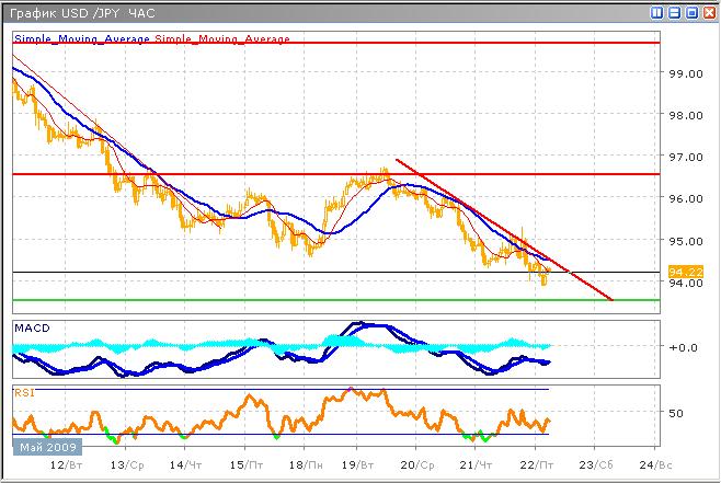 Ухудшение перспектив американской экономики негативно отразилось на спросе на американскую валюту, даже на фоне снижения фондовых рынков. Слабость восстановления американской экономики вынудит Федеральное правительство к удержанию ставки по федеральным фондам на низком уровне, что и отпугнуло инвесторов от покупок долларов. В настоящий момент японская иена значительно укрепилась против доллара, сегодняшние ранние торги протекают строго в нисходящем направлении на фоне снижения котировок акций на азиатских площадках. Однако, пара несколько торговых дней торгуется в широком боковом коридоре, что предупреждает участников торгов о предстоящей смене направления рынка. Технические индикаторы указывают на отсутствие активности с обеих сторон. График индикатора RSI постепенно приближается к средней линии, что в нынешних условиях не является сигналом. Гистограмма осциллятора MACD находится у нулевой отметки, отражая отсутствие идей на рынке.