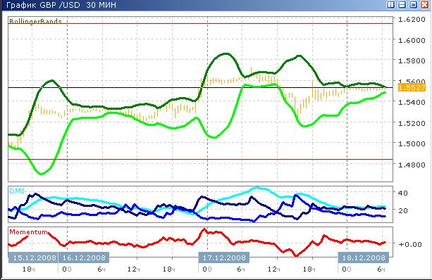 Вчерашний рост фунта против доллара завершился на уровне 1.5514, и сегодня пара движется, колеблясь вблизи этой отметки. Внутридневной максимум достигнут около 3 часов на уровне 1.5555. Торговый диапазон ограничен линиями 1.5460 и 1.5570. Индикатор среднего напавленного движения ADX показывает, что тренд слабый, так как его значения находятся ниже 25. Рост цен преобладает над падением, судя по показаниям DI+. Индикатор момента показывает, что цена растёт медленно (скорость порядка +0.002).