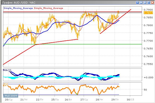 Восходящий тренд встретил на своем пути сильное сопротивление, которое тестируется уже неделю. Ранее, протестировав данный уровень сопротивления, цена преодолела его, достигнув максимальной в этом году отметки, однако покупателям не удалось удержаться на этих уровнях, и пара стремительно снизилась. В данный момент, в среднесрочной перспективе, пара продолжит рост с долгосрочной целью 0.7900, достижение этого уровня не займет много времени. Технический анализ информирует о вероятном ослаблении возрастающего тренда, поэтому в течение сегодняшней сессии бычий тренд имеет слабый потенциал. Осциллятор MACD указывает на ослабление покупательной активности, низкая активность должна насторожить участников торгов, скользящие средние индикатора пока не подают каких-либо разворотных сигналов. График индекса относительной силы, еще далек от области перекупленности, но продолжает достаточно динамично расти, что дает некоторую надежду на продолжение роста.