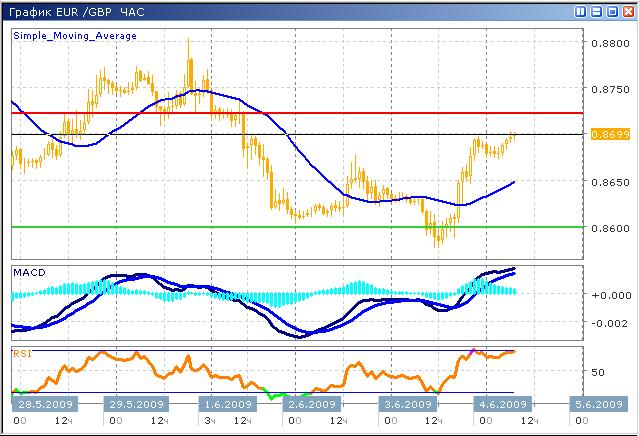 Наиболее вероятно продолжение торгов в широком нисходящем канале. В настоящий момент наблюдаем падение активности продавцов, преградой которым стала верхняя граница у отметки 0.8700. Ранее эта сторона канала тестировалась, в результате чего цена была отброшена далеко вниз, однако, медведи не исчерпали полностью свой ресурс, результатом чего станет еще одно тестирование уровня поддержки 0.8600. Технические индикаторы указывают на падение активности продавцов, вследствие чего сохраняется вероятность коррекции в нисходящем направлении. Гистограмма MACD стремительно падает, приближаясь к нулевой линии. График индикатора RSI находится у нижней границе области перекупленности, и в скором будущем, вероятно, покинет это место. В настоящий момент рекомендуется воздержаться от покупок, и занять короткие позиции.