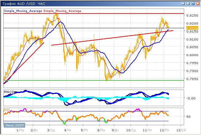 Уровень сопротивления 0.8150, являющийся продолжением линии шеи фигуры голова-плечи, был преодолен вялым броском цен, вызванным новостями из США. В краткосрочной перспективе ожидается снижение, на что указывают технические и фундаментальные факторы. Осциллятор MACD сигнализирует об остром спаде движущей силы возрастающего тренда, гистограмма стремительно снижается, возникает косвенный сигнал на продажу, с целью снижения к отметке 0.8050. Скользящие средние индикатора также находятся в предсигнальном состоянии. График индикатора RSI сигнализирует о снижении, выйдя из зоны перекупленности, и пробив среднюю линию.