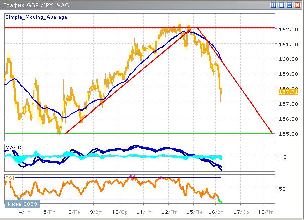 Наиболее вероятно, что после глубокой коррекции, пара продолжит рост, и достигнет максимума 12 июня 162.00. в среднесрочной перспективе, однако в ближайшее время ожидается продолжение медвежьей тенденции. Укрепление йены против доллара на фоне волатильности на фондовых рынках послужило причиной к снижению пары, однако спрос на японскую валюту не будет длиться вечно, тем более, что долгосрочные цели очень высоки. Технические средства прогнозирования указывают на продолжение падения пары в краткосрочном плане, который имеет достаточно значительный потенциал. Несмотря на продолжительное активное падение, гистограмма осциллятора MACD по-прежнему не наметила каких либо разворотных точек, в то время как график индикатора RSI пребывает в области перепроданности, намекая на возможную краткосрочную коррекцию. Краткосрочная цель снижения находится у отметки 156.00, первый уровень поддержки , который может быть взят к следующей сессии.