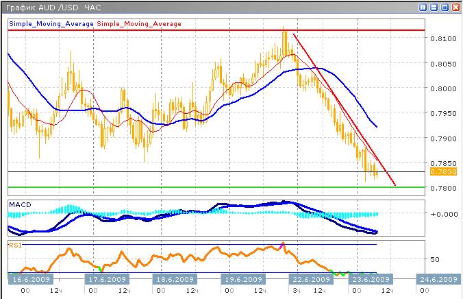 Пара стремительно снижается на фоне всеобщего укрепления доллара США, и падения цен на сырьевых рынках, что оказало давление на австралийскую валюту. сопротивление 0.7900 не смогло удержать продавцов, в результате чего, некогда достаточно прочное дно ценовых колебаний, было прорвано, и пара устремилась вниз. Технический анализ информирует нас о первых сигналах замедления нисходящего тренда, поэтому в течение сегодняшней сессии возможен рост. Осциллятор MACD формирует двойной сигнал на покупку, гистограмма сформировала локальный минимум, пересекла соответствующим образом скользящие средние, в то время как сами скользящие средние также пересекаются таким образом, что формируется сигнал к покупке. График индекса относительной силы, постепенно выходит из области перепроданности, и вероятно уже сегодня даст сигнал к покупке.