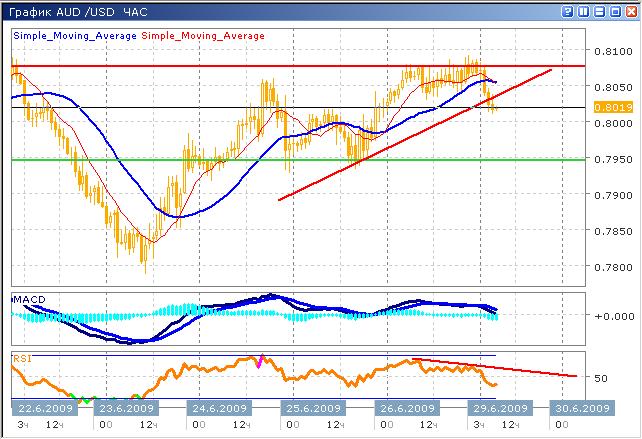 Снижение постепенно замедляется, цена достигла низких уровней, где покупки уже более привлекательны, нежели продажи. В долгосрочной перспективе, продолжение роста более вероятно, чем снижение. Нисходящий тренд приблизился к уровню, представляющему собой психологический уровень 0.800, который, вероятно будет концом коррекции пары, что видно на часовом графике. Индикатор MACD информирует нас о возможном развитии краткосрочного роста, однако с учетом глобальных настроений, длительного тренда ожидать не стоит. График индикатора RSI пока не дал сигналов на продажу, однако формирует медвежье расхождение, что несколько настораживает покупателей. По этой причине от длинных позиций рекомендуем воздержаться, более безопасной стратегией было бы ожидание завершения коррекции, и последующая покупка на более убедительных сигналах.