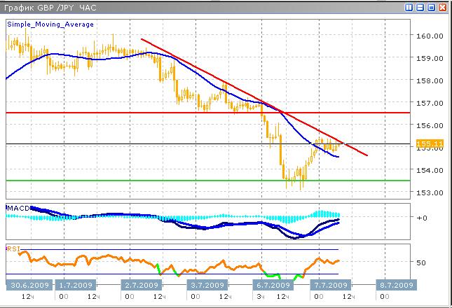 Текущий бросок вверх изменил медвежьи настроения по паре, сценарий среднесрочного роста наиболее вероятен. Цель расположена у отметки 156.50, которая соответствует уровню сопротивления, отложенного от ранее тестируемой и пробитой поддержки, которая видна на часовом графике. В настоящий момент технические индикаторы указывают на продолжение роста, поскольку бросок был значительным, он не может остаться без внимания быков. Осциллятор MACD демонстрирует рост моментума бычьего тренда, что встречается с оптимизмом перед началом торгов в Европе. Индекс относительной силы также подает позитивный сигнал, однако очевидно, что потенциал роста не велик.