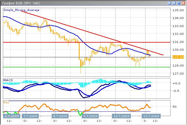 Пара встретила локальную поддержку у отметки 127.70, которая вероятно, станет завершением нисходящего тренда. Результатом текущей тенденции может стать рост цен к уровню сопротивления 130.90, после чего ожидается откат. В настоящий момент активность быков выросла, целью среднесрочного роста является заявленный уровень. Индикаторы начали сигнализировать об ослаблении восходящей коррекции, динамика моментума, который иллюстрирован индикаторами на графике, согласуется с ценовым графиком, что говорит об отсутствии необоснованных ценовых бросков. На часовом графике осциллятор MACD демонстрирует медвежьи краткосрочные настроения, гистограмма пересекла нулевую ось, в то время как скользящие средние индикатора также пересекаются в нисходящем направлении. График индикатора RSI пересек среднюю линию в нисходящем направлении, также подавая сигнал к продаже. Ожидается еще одно тестирование уровня поддержки, после чего рост может возобновиться.