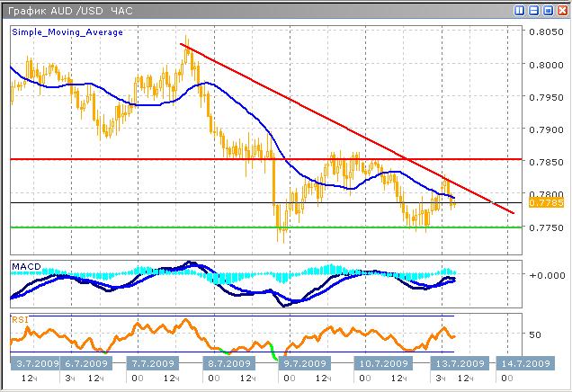 Снижение значительно замедлилось, после чего цена достигла низких привлекательных для покупок уровней. Ближайший локальный уровень сопротивления расположен у отметки 0.7850, который, вероятно, будет взят не сразу, но и сильного сопротивления здесь ожидать не стоит. Среднесрочная цель расположена у отметки 0.7900, у данного уровня рост может замедлиться, вероятен глубокий откат. Индикатор MACD информирует нас о низком потенциале краткосрочного роста, текущее положение гистограммы говорит о невысокой активности участников рынка с обоих сторон. График индикатора RSI колеблется около средней линии, подавая то сигнал к покупке, то к продаже. В текущий момент рекомендуем воздержаться от покупок, до окончания коррекции.