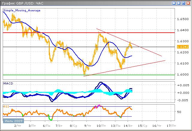 В настоящий момент наиболее вероятно краткосрочное снижение, с целью, по меньшей мере к уровню 1.6200, пара рисует сходящийся треугольник, фигура достаточно противоречивая. Технические индикаторы указывает на продолжение нисходящей тенденции, график индикатора RSI достигнув нижней границы области перекупленности, снижается, поскольку быки недостаточно сильны для импульса. Гистограмма MACD пересекает скользящие средние таким образом, что возникает сигнал к продаже, при этом снижаясь к нулевой оси, иллюстрируя отсутствие движущей силы со стороны покупателей, что в условиях разворота является дополнительным сигналом к завершению восходящего тренда.