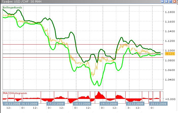 USD/CHF также показывает боковой тренд, немного упав. Линии Боллинжера(как, впрочем, и другие индикаторы) не дают однозначной информации о дальнейшем поведении цены, так что единственное что нам остается - следить за новостями, благо сегодня их ожидается масса как по Еврозоне, так и по США.