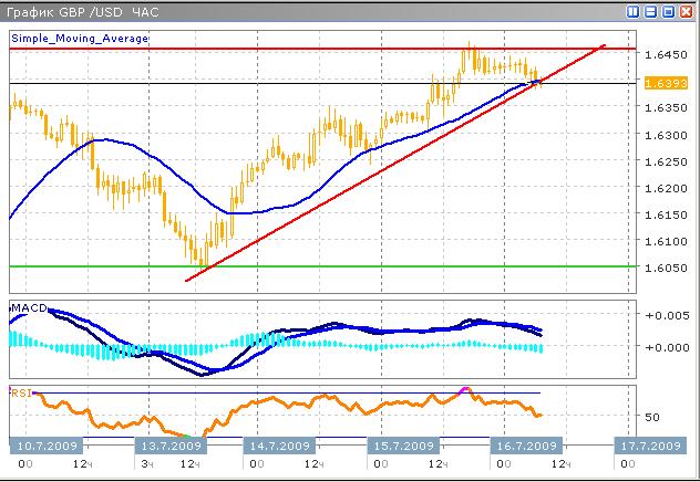 Резкое повышение задержалось у отметки 1.6450, после чего началось развитие тренда в боковом направлении. Наиболее вероятно, что откат завершился, судя по сигналам технических индикаторов. Коррекционное движение составило незначительную величину от предыдущего роста, достаточно вялые торги в начале сегодняшнего дня также могут послужить сигналом к развороту, характеризуя возврат инициативы к стороне покупателей. Математические индикаторы также указывают на завершение нисходящего тренда, гистограмма MACD готовится к развороту, что является достаточным сигналом к отказу от дальнейших продаж. График индикатора RSI приблизившись к средней линии сверху вниз, разворачивается. Очевидно, что данный момент является выгодным для занятия длинной позиции, с первой целью 1.6450, и следующей за ней 1.6600