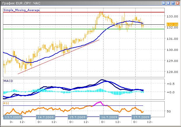 На часовом графике отчетливо видим, что цена достигла уровня поддержки, который расположен вблизи отметки 131.80. В краткосрочной перспективе ожидается рост, поэтому нахождение цены около этого уровня является лишь вопросом времени. После роста выше отметки 133.40, пара, вероятно, продолжит рост, при этом, тенденция может продолжиться в течение предстоящих нескольких торговых дней, и к концу следующей недели достигнет ранее тестируемого сопротивления 137.00. Тем не менее, совершенно очевидно, что рост замедлился, и быки демонстрируют признаки слабости, что выражается достаточно длительными торгами в боковом тренде. В настоящий момент индикаторы сигнализируют об умеренном росте сил покупателей. На часовом графике осциллятор MACD подает сигнал на покупку, гистограмма формирует локальный минимум. В то же время, график индикатора RSI пробив среднюю линию, развернулся и начал рост. Занятие длинных позиций предполагает длительное нахождения в рынке, поскольку в среднесрочном плане ожидается рост цен.