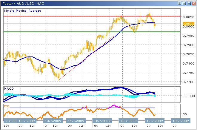 Рост несколько замедлился, и цена упала к уровню поддержки, после чего вновь продолжила рост. Ближайший локальный уровень сопротивления расположен у отметки 0.8050, который, вероятно, будет взят не сразу, но и сильного сопротивления здесь ожидать не стоит. Среднесрочная цель расположена у отметки 0.8200, у данного уровня рост может замедлиться, вероятен глубокий откат. Индикатор MACD информирует нас о низком потенциале краткосрочного роста, текущее положение гистограммы говорит о невысокой активности участников рынка с обоих сторон. График индикатора RSI вошел в зону продавцов, что говорит о возможной коррекции в краткосрочном планировании, что, однако, не угрожает среднесрочному возрастающему тренду. Все же в текущий момент рекомендуем воздержаться от покупок, до окончания коррекции.