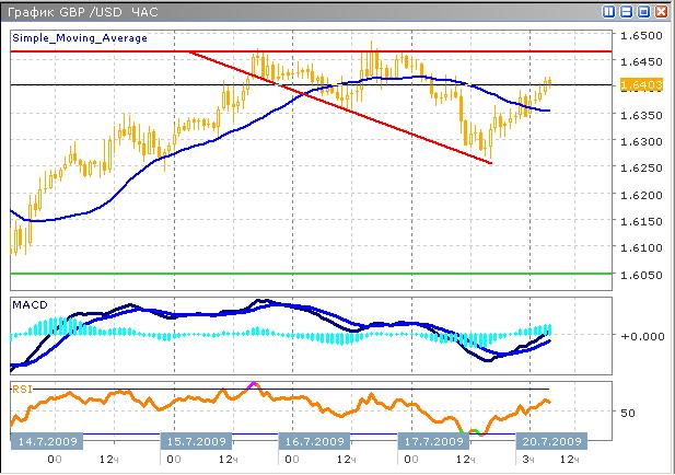 В краткосрочном плане ожидается снижение пары, после чего рост продолжится. Перспективы британской экономики несколько улучшились, выход цены из горизонтального бокового коридора 1.64 – 1.6450 обусловлен не только ростом американских фондовых рынков, но и положительной статистикой британского потребительского сектора и улучшением ожиданий экономического роста. Технические средства прогнозирования информируют участников рынка о начале нисходящей коррекции с целью 1.6250. Совершенно очевидно, что оптимизм быков несколько снизился, что было выражено замедлением роста, и непродолжительным боковым движением цены вблизи отметки 1.6460. Индикатор MACD дает адекватные текущим прогнозам сигналы, гистограмма находится ниже нуля, а скользящие средние нацелены вниз. График индикатора RSI в очередной раз тестирует нижнюю границу области перекупленности, что должно насторожить покупателей, и в некоторой степени гарантирует спад активности быков. В среднесрочной перспективе ожидается рост пары.