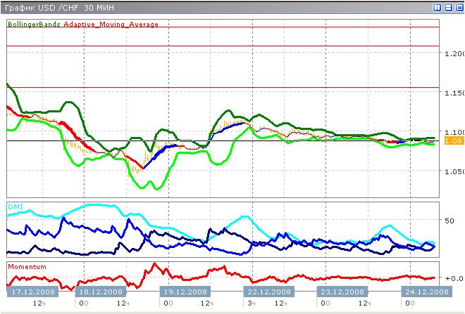 Доллар сегодня рано утром вырос против франка до внутридневного максимума на уровне 1.0896. Сейчас пара колеблется вблизи отметки 1.0859. Тренд очень изменчив, что подтверждает индикатор среднего направленного движения, котороый едва превышает значение 20. Преобладает слабая нисходящая составляющая движения DI- (порядка 17). Скорость изменения цен ещё ниже чем у eur/usd и составляет примерно -0.005.